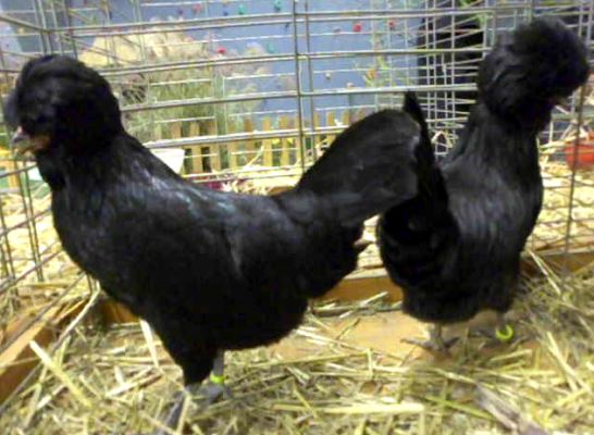Paduane crna, Cüce Pado Fizan siyah. 85 Jahre Association des Aviculteurs de Lutterbach. F 68460 Lutterbach 5./6.11.2011. Im Hintergrund kräht ein Zwerg-Paduanerhahn. Eine sehr schöne Ausstellung.