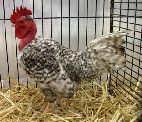 Bantam with Rosecomb cuckoo, Cou Nu naine coucou avec crête frisée,